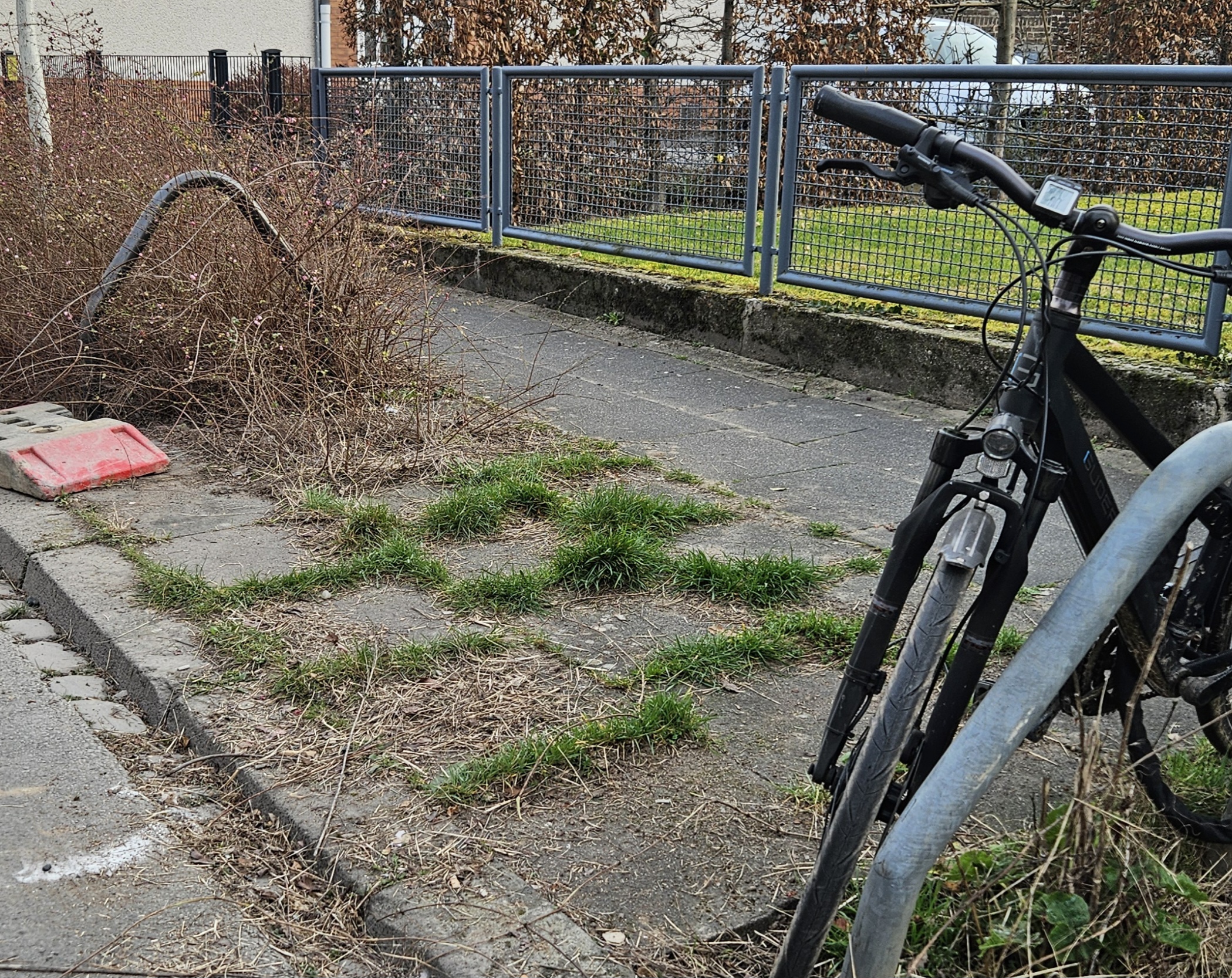 Ein Fahrrad an einem Schutzbügel der Bäume anzuschließen, ist an der einen Seite wegen des verwilderten Beetes nicht möglich, an der anderen Seite suboptimal, da das Rad Fußgänger bzw. das Einbiegen in die Einfahrt des Hauses beeinträchtigt.
